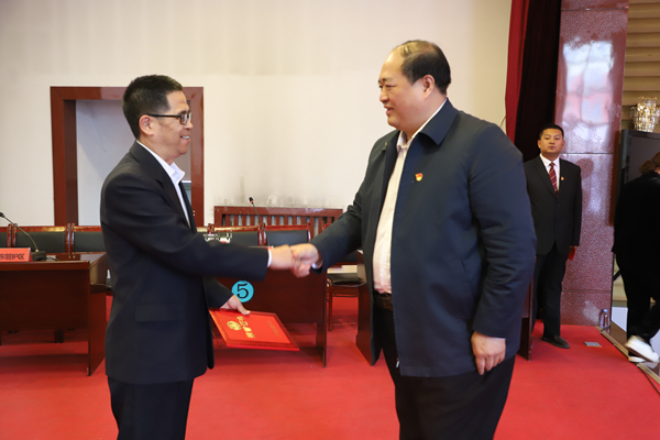 阿木爾林業局黨委書記胡守慶(右)為獲得第一名代表隊頒發榮譽證書。