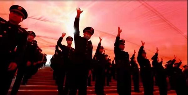 伴隨著激昂的樂曲,一面400平方米的巨幅黨旗緩緩展開,面向鮮紅的黨旗,在場的黨員干部和居民群眾心潮澎湃。100名黨員整齊列隊,在領誓人的帶領下舉起右拳,莊嚴宣誓,重溫入黨誓詞,回望入黨初心,抒發對黨忠誠的意志和信念。