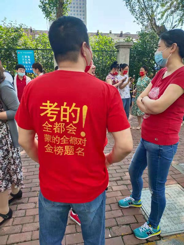 助考媽媽,口罩上的文字為金榜題名,圖左家長身穿旗袍,寓意旗開得勝。