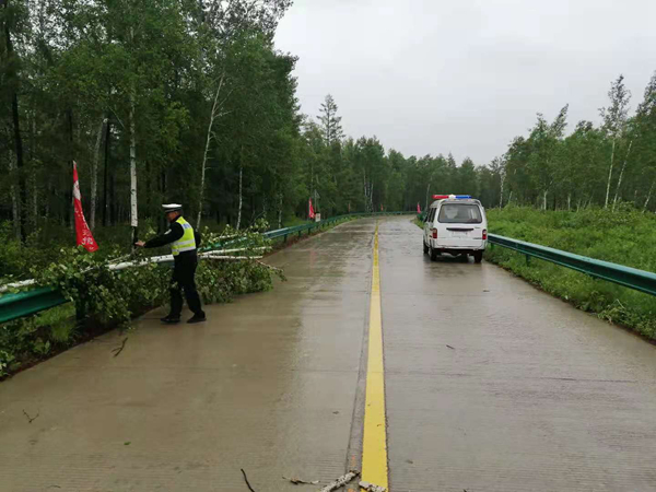 交警大隊(duì)派出警力增援北極中隊(duì),擴(kuò)大巡邏范圍,及時(shí)排查發(fā)現(xiàn)G111、G331國(guó)道、景區(qū)周邊路段交通隱患。在北極村至北紅村路段,發(fā)現(xiàn)由于暴雨沖刷,該路段3處山石、樹(shù)枝堆積在路面,2處樹(shù)木刮倒,嚴(yán)重影響路面通行安全。巡邏民警立即對(duì)險(xiǎn)情進(jìn)行處置。針對(duì)3處漫水較為嚴(yán)重區(qū)域,設(shè)置警戒線等警示標(biāo)志,告知過(guò)往車輛通行路況,提醒車輛減速慢行,同時(shí)通知相關(guān)部門及時(shí)處置。