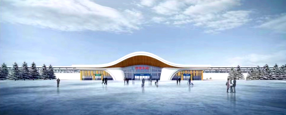 林口南站建筑面積2998.19平方米,可容納800旅客候車。設2條正線,2條到發線,站房外觀設計如同“林中木屋”,融入林口縣特有的“山水神秀”文化底蘊,給人以厚重堅實之感,并將英雄之城的紅色文化融入其中,象征城市精神如山巒屹立。兩側較小體塊烘托中部門式造型,窗格構件相互交織,如森林霧凇,體現寒冷地區建筑特質,具有雪原建筑意向。車站穩重大氣、簡潔壯麗,通過現代建筑語言詮釋了站房的人文之靈,彰顯現代交通建筑特征。