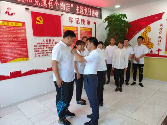在馬林林場分會場,2名老黨員正在為預(yù)備黨員佩戴黨徽,這光榮的儀式對于新黨員來說是一種榮譽(yù)、一種激勵、一種鞭策,更是中國共產(chǎn)黨人精神的傳承。