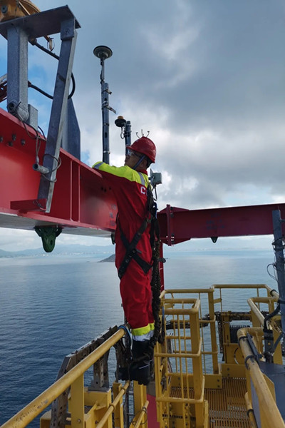 一次在進行天線布設時,平臺因遭遇較大的海風而劇烈搖晃,為了盡快完成設備布設,成員努力保持身體平衡,在平臺井架頂部工作近 5 個小時,直到夜幕降臨才返回平臺上。“在海上爬到百米高度時,我們真正體會到‘高處不勝寒’,但是大家還是克服了恐懼,堅持完成任務。”何東旭說。