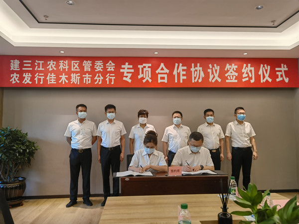 黑龍江經濟網訊(郭明儒 王鐵鑫)8月4日,農發行佳木斯市分行與黑龍江建三江國家農業科技園區管理委員會(以下簡稱建三江農科區管委會)簽署專項合作協議。農發行佳木斯市分行黨委書記、行長于智源,黨委委員、副行長張洪昌,建三江農科區管委會黨工委副書記、管委會主任牟秀玲,管委會領導衣志輝、李慶飚、李彩麗等出席簽約儀式。