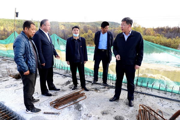 林業局黨委副書記、局長韓鳳泉(右一)深入在建楚龍溝大橋現場落實泄洪措施,確保國道G111安全。