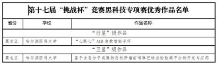黑龍江經濟網訊(黑龍江日報全媒體見習記者董廣碩 商祺)近日,第十七屆“挑戰杯”全國大學生課外學術科技作品競賽落下帷幕,哈爾濱醫科大學附屬二院團隊《“心聯心”AED急救智能手環》和哈醫大附屬腫瘤醫院團隊《基于全息分子成像系統的惡性腫瘤前哨淋巴結活檢檢測平臺的開發與應用》兩個作品在“黑科技”專項賽終審決賽中,分別榮獲“行星級”和“衛星級”稱號。