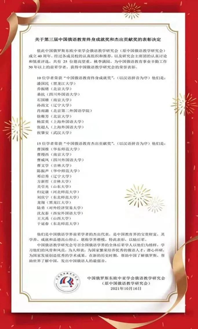 今年恰逢黑龍江大學建校、黑龍江大學俄語學院建院80周年。八十年來,眾多德才兼備的優秀教師為黑大俄語專業建設、為中國俄語教育事業發展貢獻了畢生力量。李錫胤教授、華劭教授與張家驊教授曾獲“中國俄語教育終身成就獎”,鄭述譜教授與金亞娜教授曾獲“中國俄語教育杰出貢獻獎”。此次潘國民教授與龍翔教授榮獲表彰,再次肯定了黑龍江大學老一輩俄語教師對國家俄語教育事業發展做出的突出貢獻。