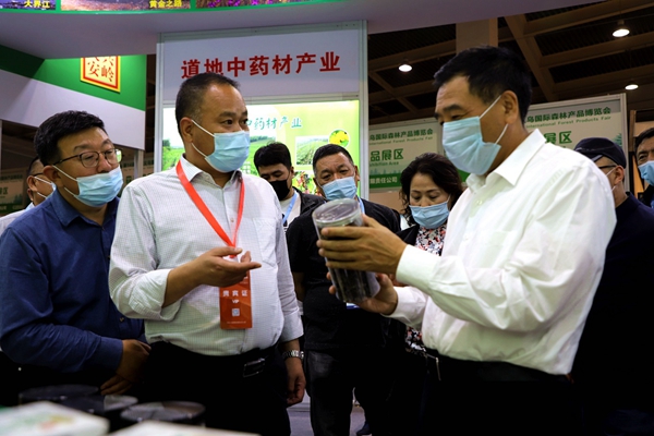 阿木爾林業局黨委書記胡守慶(右一)查看參展產品質量情況(王力/攝)