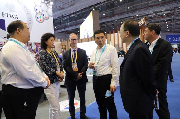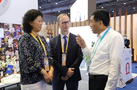 李軍、陳昱兩位集團公司領導走進北極冰藍莓酒莊設立在法國FIWA的站臺,向FIWA國際大獎賽主席、法國國際品評鑒定酒類專家協會主席奧利維耶·布什,以及法國FIWA SAS股份有限公司總裁張莉推介了參展的藍莓冰酒、藍莓雪酒等產品在剛剛結束的義烏森博會受到客戶青睞情況,尤其是重點介紹了大興安嶺地處祖國最北方,日照時間長,晝夜溫差大,天然純降水,生長出野生藍莓具有花青素含量高的特點,其產品藍莓冰酒、藍莓白蘭地等在法國國際葡萄酒大獎賽、有機葡萄酒大獎賽和烈酒大獎賽上斬獲大金獎、金獎。