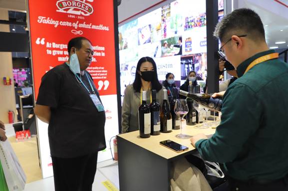 圖為大興安嶺林業集團公司黨委副書記、總經理李軍(左二)向法國參展企業推介北極冰藍莓酒莊紅酒系列產品(王力/攝)