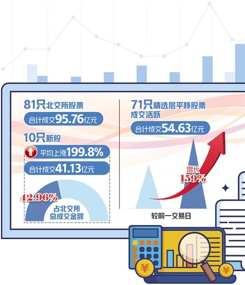 北交所首個交易日運行平穩,81只股票合計成交95.76億元。首批上市交易的10只新股全線上揚,盤中均觸發兩次臨時停牌。截至收盤,10只新股平均較發行價上漲199.80%。71只從精選層平移至北交所的股票漲跌互現。