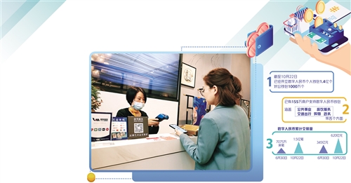 線下場(chǎng)景日益多元的同時(shí),數(shù)字人民幣交易場(chǎng)景也正在發(fā)力線上,形成了“線上+線下”并行推廣的格局。現(xiàn)在,數(shù)字人民幣已經(jīng)可以在京東、美團(tuán)、滴滴等多個(gè)線上場(chǎng)景使用。截至10月22日,已有155萬(wàn)商戶支持?jǐn)?shù)字人民幣錢(qián)包,涵蓋公共事業(yè)、餐飲服務(wù)、交通出行、購(gòu)物和政務(wù)等各個(gè)方面。