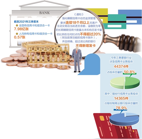 近年來,我國銀行業金融機構信用卡業務快速發展,在便利群眾支付和日常消費等方面發揮了重要作用。人民銀行發布的數據顯示,截至2021年三季度末,全國有信用卡和借貸合一卡7.98億張,人均持有信用卡和借貸合一卡0.57張。發卡量激增的同時,行業亂象也被各界詬病,尤其是消費者針對信用卡過度營銷、亂收費等問題的投訴量近年來居高不下。