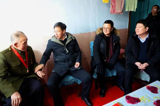 阿木爾林業局黨委副書記、局長韓鳳泉(左二)走訪慰問抗美援朝老戰士、退休老黨員張俊峰(左一)(王力 攝)