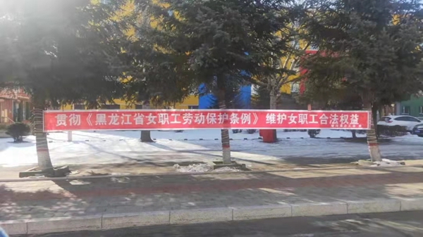 在主要街道懸掛“貫徹《黑龍江省女職工勞動保護條例》 維護女職工合法權益”宣傳條幅,提示廣大職工知曉《黑龍江省女職工勞動保護條例》,提醒、督促各單位認真貫徹執行條例,維護女職工合法權益。