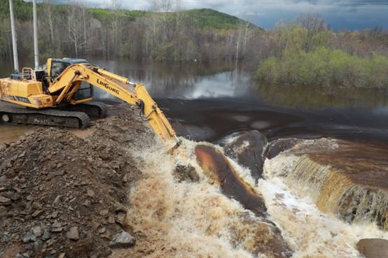 阿木爾林業(yè)局調(diào)派大型機械設(shè)備,挖開楚龍溝河大橋臨時便道,進(jìn)行泄洪,確保G111國道安全(王力 攝)