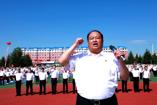 青年黨員母立巖手舉黨旗健步跑向藍莓廣場主席臺,把黨旗交到了林業局黨委書記胡守慶手中,胡守慶揮舞黨旗,臺下黨員齊聲說道:“不忘初心、牢記使命”。
