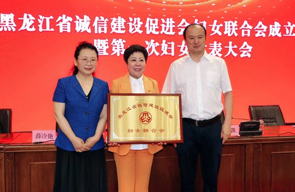 省直機關工委副書記、全省性社會組織黨委書記徐凱,省婦女聯合會黨組成員、省政府婦兒工委辦主任姜秀麗為黑龍江省誠信建設促進會婦女聯合會頒發牌匾。
