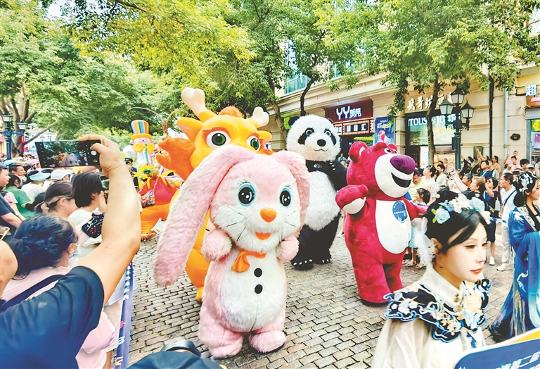 巡游隊伍中有身著漢服的美麗姑娘,有練雜耍的“小丑”,有可愛的卡通人物等。他們一邊走一邊與游客互動、合影,為游客們帶來歡樂,也為百年老街增添了更多魅力。
