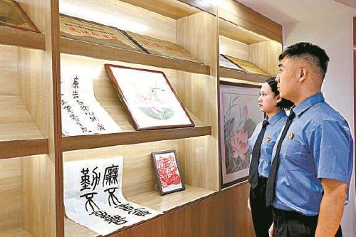 9月8日,黑龍江省牡丹江市東安區檢察院青年干警駐足觀看廉潔書畫作品