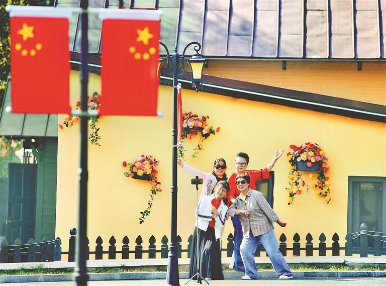 2日,哈爾濱市南崗區花園街歷史文化街區,節日氣氛濃厚,游客們紛紛在“黃房子”旁打卡拍照。
