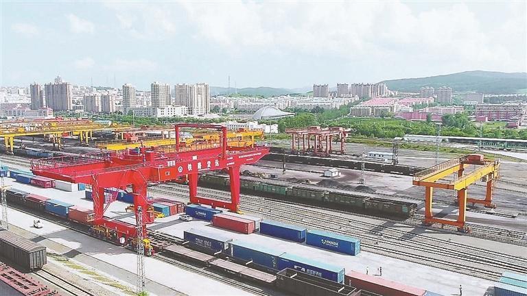 6日上午,百年口岸綏芬河鐵路車站換裝貨場內,塔吊在高效有序地對進出境貨運列車進行著換裝作業。